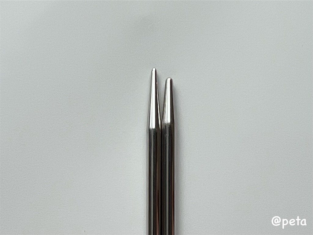 針先は片方がレース向きの尖った形状、もう片方は丸みを帯びた編み地を傷つけない(糸を割りにくい)仕様になっています。