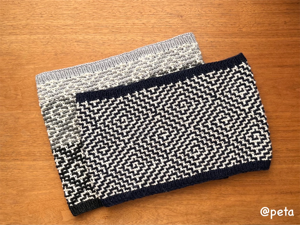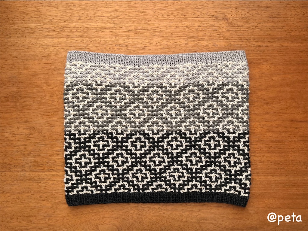 「初めてでも編みやすいベルンド・ケストラーのモザイク編み」に掲載されている、クロス模様の編み図を元にネックウォーマーを編みました。
