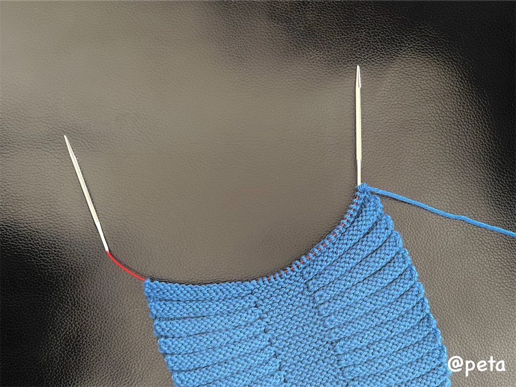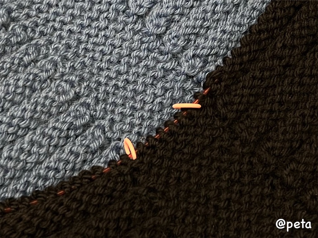 引き返し編みは迷子になりやすいこともあり、途中から目数リングを2つ使いました。